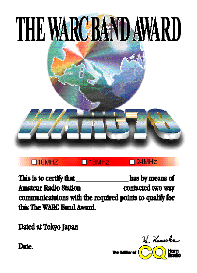 このバンドは,今回のサイクル23で,ハムバンド誕生以来の活況を呼ぶものと期待されています.また,期間限定でWARCバンド・アワードも発行します.この機会にあなたもぜひ,このWARCバンドにチャレンジしてみませんか.