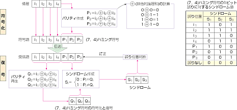 Bluetoothなどの情報通信では,S/Nの低下や干渉の影響により,情報誤りが生じてしまう.ディジタル情報通信では,一般的にこれらの耐性をもつものとして誤り訂正符号が適用される.誤り訂正符号は,ブロック符号と畳み込み符号の2種類に大別される. ブロック符号は,情報ビット(ブロック)に誤り訂正用のビット(ブロック)を付加するもので,畳み込み符号は情報ビットに誤り訂正ビットを埋め込むものである.また,情報の誤りには大きく分けて,ランダム誤りとバースト誤りの二つのタイプがある.ランダム誤りは連続時間に飛び飛びの情報ビットに誤りを起こすもので,バースト誤りは短時間に一部分が集中的に誤るものである. Bluetoothではランダム誤りを訂正するために,ブロック符号であるハミング符号を採用している.ハミング符号では,1ブロック中の1ビットの情報誤りを訂正できる.付加する誤り訂正符号がmビットの場合,訂正可能なブロックサイズは2m−1ビットである.そのため,符号化率と呼ばれるブロックサイズと情報ビットの比は(2m−1−m)/(2m−1)となる. ハミング符号の表記には,(ブロックサイズ,情報サイズ)が用いられる.たとえば,m=3ならばハミング符号(7,4)と表記する.ハミング符号(7,4)の誤り訂正符号化と誤り検出・訂正の仕方を,図6に示す.