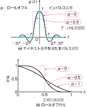 Bluetoothでは符号化率2/3の誤り訂正符号として,ハミング符号(15,10)を適用している.さらに,符号化率1/3の誤り訂正符号として,3回同じ情報を送信する単純繰り返し法も採用している. 次に,波形等価について述べる.近年,携帯電話などに代表される情報通信機器の普及により,無線回線における周波数帯域の不足が問題となっている.このことから,広い占有帯域幅を必要とする通信方式は望ましくない.一方,ディジタル信号には,たくさんの高調波成分(スペクトル帯域)が含まれている(本誌2000年2月号特集 第2章1.1項参照). もし,ディジタル(情報)信号をそのまま変調すれば,この高調波成分も変調することになり,非常に広い周波数帯域を占有してしまう.そのため,一般的にはディジタル情報信号の帯域をフィルタにより制限したあとで変調を行い,帯域幅を狭帯域化して適用する手法が用いられる. しかし,むやみに帯域を制限するとディジタル信号がパルス波形でなくなってしまい,情報復調時に誤った判断をする可能性が高くなる.そこで,帯域制限されたディジタル信号が干渉なしにディジタル(パルス)として扱うことのできる基準が設けられており,これを「ナイキスト基準」という. さらに,このナイキスト基準を満たしたうえで帯域制限を行うフィルタの周波数特性を「ロールオフ特性」という.図7は,ナイキスト基準を満たすパルス波形と,正規化周波数軸上でのロールオフ特性である.