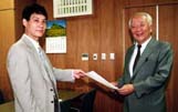 郵政省で稲田移動通信課長(左)より許可を受ける原連盟会長