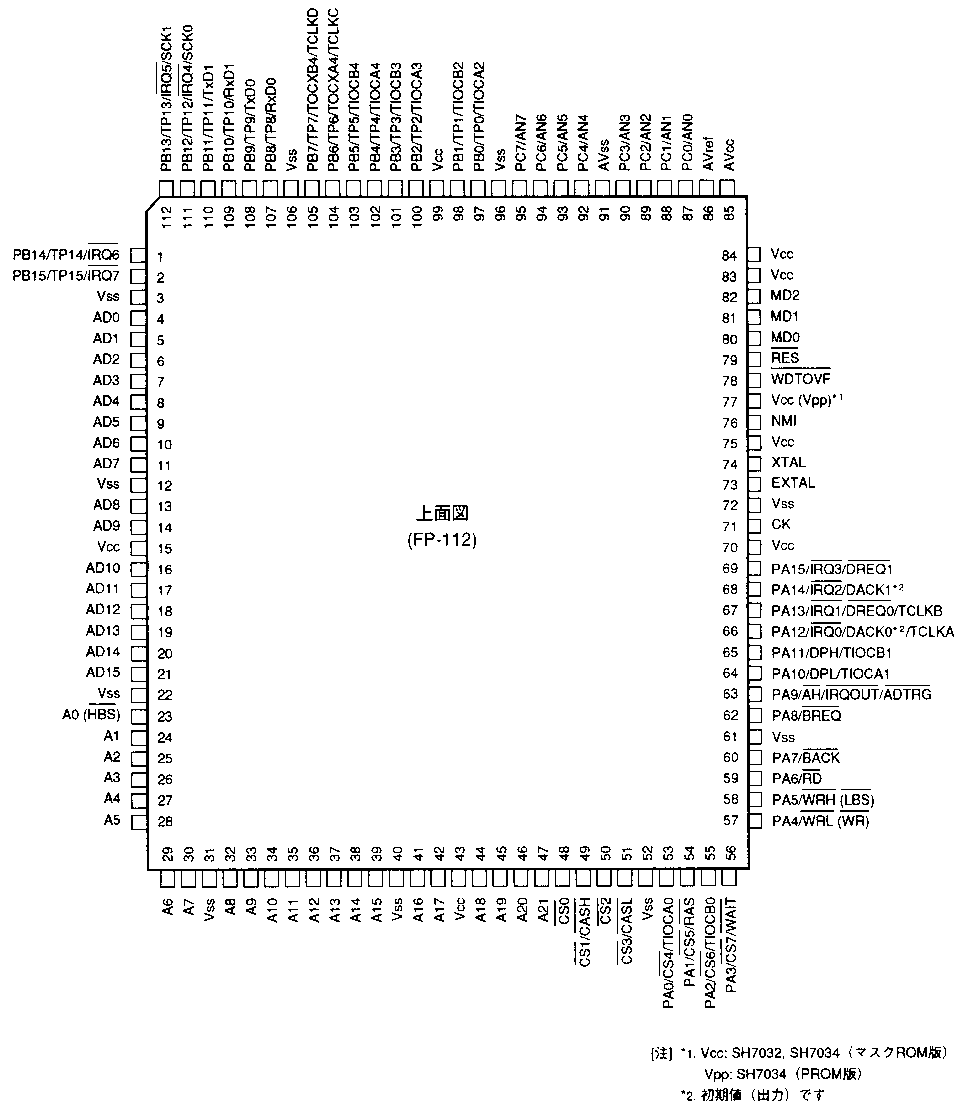 | 動作状態 | ●動作モード 内蔵ROMなしモード 内蔵ROMありモード(SH7034のみ) ●処理状態 パワーオンリセット状態 マニュアルリセット状態 例外処理状態 バス権解放状態 低消費電力状態 ●低消費電力状態 スリープモード スタンバイモード |