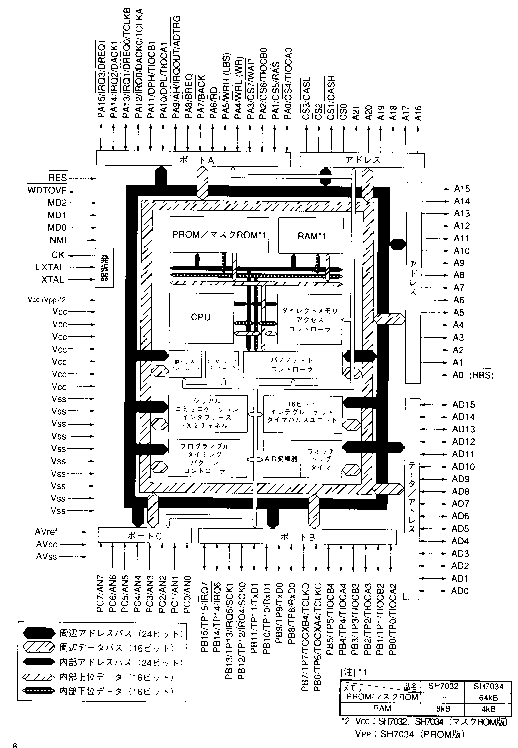| バスステートコントローラ(BSC) | ●外部のメモリアクセスをサポート 外部データーバスは16ビット ●アドレス空間を8エリアに分割 各々のエリアに以下の特性を設定 バスサイズ(8/16ビット) ウェイトサイクル数の設定可否 空間の種類(外部メモリ空間/DRAM空間など) ・DRAM用/RAS,/CAS信号を出力 ・RASプリチャージタイム確保用Tpサイクル発生可能 ・アドレスマルチプレクスを内部でサポートし,DRAM直結可能 各エリアに対応したチップセレクト信号(CS0〜CS7)を出力 ●DRAMリフレッシュ機能 プログラマブルなリフレッシュ間隔 CASビフォRASリフレッシュ/セルフリフレッシュをサポート ●DRAMバーストアクセス機能 DRAMの高速アクセスモードをサポート ●外部WAIT信号によりウェイトサイクルの挿入可 ●1段ライトバッファによる性能向上 ●データーバス用パリティ生成/チェック可能 |