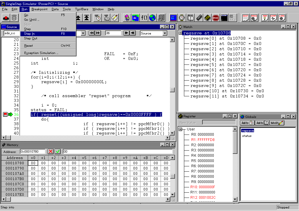 CQ RISC評価キット/PowerPC403に付属するデバッガは実機デバッガではなく,シミュレーション・デバッガであるSoftware Development Systems,Inc.のSingleStep Version7.1(Demonstration License)を採用.