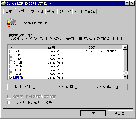 プリンタのプロパティを開き,「ポート」タブを開きます.通常はプリンタを接続しているポートが選択されているはずですが,ここで図のように「FILE」を選択します.これでPARTNERが起動できます.PARTNERを使い終わり,またプリンタを使う場合は,正しくプリンタを接続しているポートに選択し直します.