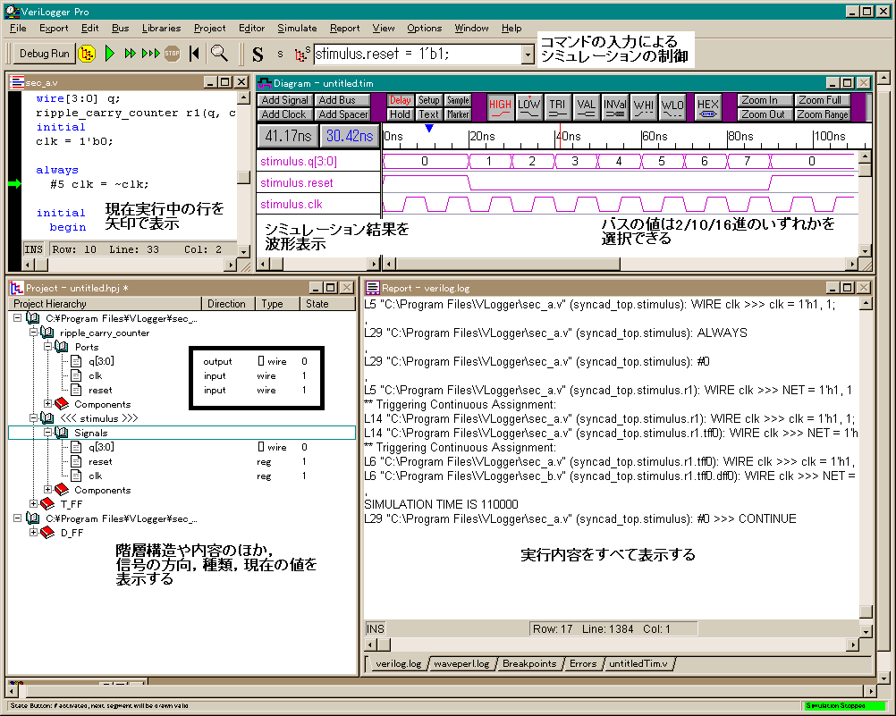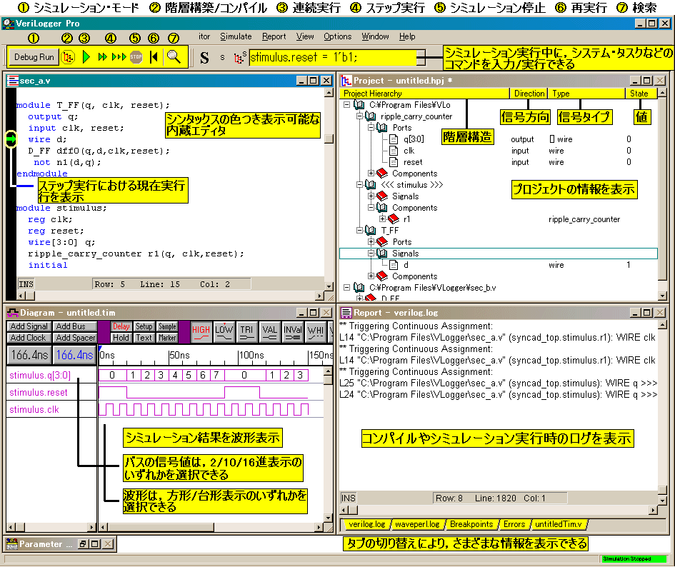 回路設計において,設計した回路のシミュレーションは必須の作業ですが,シミュレータに与えるテスト・スティミュラスの準備や,ソース・コードの管理,およびデバッグは面倒な作業です.VeriLogger Proはテスト・スティミュラスを作成しながらシミュレーションを行えるインタラクティブ・シミュレーション機能や,ソース・コードの管理を行うプロジェクト・マネージャ,ソース・レベル・デバッガなどを装備した使いやすいVerilog-HDLシミュレータです.しかも,WaveFormer Proのテスト・スティミュラス作成機能など,同商品の全機能も装備したハイパー・ツールです.VeriLogger Proの概要