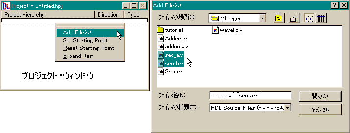 Projectウィンドウでマウスの右ボタンをクリックしてAdd File(s)メニュを起動した後,必要なソース・コードを選択します(図2).