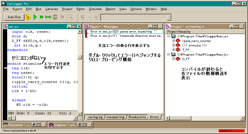 VeriLogger Proは,作成したVerilog-HDLソース・コードをプロジェクトという単位で管理し,階層構造を自動的に認識してコンパイルを行うので,ユーザが階層構造に気を遣う必要はありません.またソース・コードに文法エラーがあれば,エラーのある行とエラー・メッセージを表示し,内蔵のシンタックス・カラーリング・エディタにエラー行を表示するので,これを修正できます.