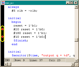 VeriLogger Proは,複数のブレーク・ポイントを設定できます.これは,設定した特定のソース・コードまで実行を行ったのち,シミュレーションを一時停止するというものです.これにより,ブレーク・ポイントまでは連続してシミュレーションを行い,この後はステップ実行で詳細な実行経過を追跡する,といった実行形式が実現できます.