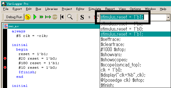 VerLogger Proは,ステップ実行時Verlog-HDLのステートメントを入力してシミュレーションを制御することができます.たとえばテスト・スティミュラスに記述されていない値をポートに与えて,これによるシミュレーション結果を見ることができます.図6では,テスト・スティミュラスにはない,stimulus.resetポートに'1'を与える(stimulus.reset = 1'b1;)というVerilog-HDLの代入文を途中で実行する例を示しています.