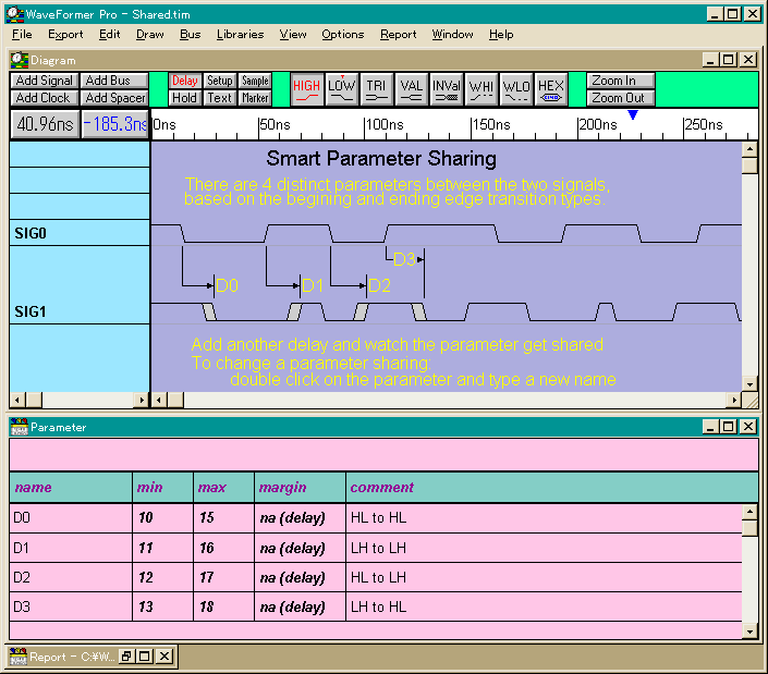 タイミング・ダイヤグラム・エディタの真価は,タイミング・パラメータを通した異なる信号遷移間の関連付けにあります.Waveformer Proはタイミング・パラメータの三つの基本的な型である遅延時間,セットアップ・タイム,ホールド・タイムを最大値,最小値などの幅をもたせて波形に条件付けすることができます.これらの作業は,ダイヤグラム・ウインドウでの遷移位置の指定,パラメータ・ウインドウでのパラメータ名と数値の代入による簡単な操作でできます(図4).