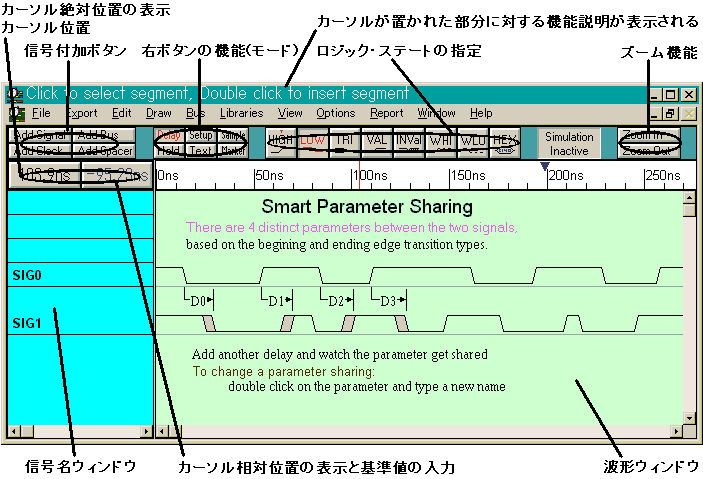 マウス操作回数の少ない効率的な方法で波形セグメント(信号のある遷移から次の遷移まで)の描画と編集ができます.はじめは目盛りを参考にしながらおおざっぱな描画を行い,必要に応じて正確な値を数値で指定し直すことにより,すばやく描画と編集ができます.波形セグメント編集後の,ロジック・ステートの変更,遷移時間の変更および波形セグメントの挿入/消去なども自由に簡単な操作で行え,時間間隔の計測もすばやく行えます.