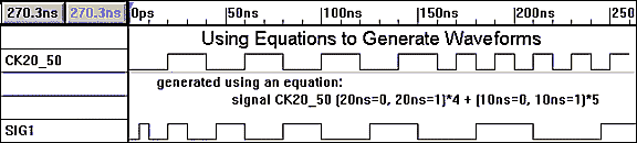 例1) 周波数が25[MHz]の波形を4周期分生成した後,50[MHz]の波形を5周期分持つ信号CK25_50の生成をWaveFormer Proに指示する場合は下記の式で表現でき,図3内上部の波形を生成します.