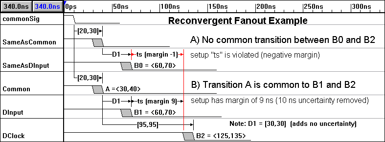 WaveFormer Proは信号間の遅延の計算において,パスの共通部分を認識し,共通部分の遅延はタイミング計算に取り込まず,信号が分かれた所から計算を始めます(図6).これにより,不必要に厳しい条件を導き出しません.