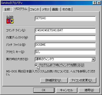 “プログラム”のTABを選択し,この中の“プログラム終了時にウィンドウを閉じる(X)”にチェックをつけます.