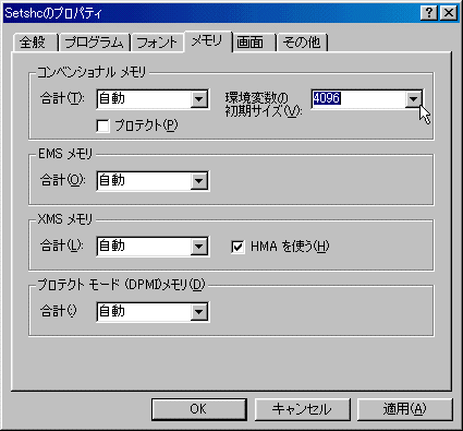 “メモリ”のTABを選択し,この中の“環境変数の初期サイズ(V)”を選択して4096バイトに選択します.
