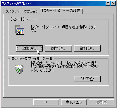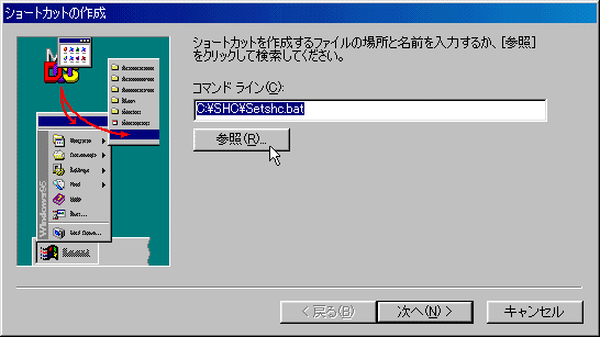 “追加”を選択して,ショートカットを選択します.ここでは C:\SHC に作成したバッチファイル SETSHC.BAT を選択します.
