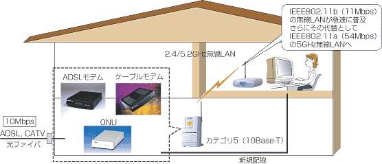 オフィスや家庭内に増加する情報機器を結ぶワイヤレスネットワークも,ブロードバンド化の波を受けて発展してきている.ISDNがおもなアクセスラインであり,伝送速度がkbpsレベルだった時代は,PHSや2.4GHz帯無線LAN(IEEE802.11,〜2Mbps)を適用したワイヤレスTAなどがネットワークのワイヤレス化に利用されてきた.しかし,近年の爆発的なADSL,CATVなどの普及によるブロードバンド化にともない,ワイヤレスネットワークにも広帯域化が望まれていた.そこで,アクセスラインに対応した伝送速度をもつ2.4GHz帯無線LAN(IEEE802.11b,〜11Mbps)が,1999年のアップルコンピュータのAirPortの発売をきっかけとした機器の低価格化もあいまって,広く普及してきている.