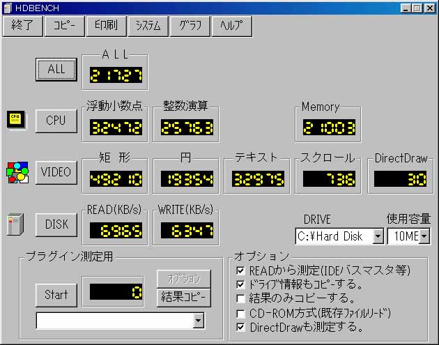 | テスト環境 メインボード ASUS P3B-F グラフィックス ASUS AGP-V3400TNT16MB ハードディスク クアンタム FBST3.2GB ATA33 メモリ PC100 64MB CPU Pentium2 400MHz システムバス 100MHz |